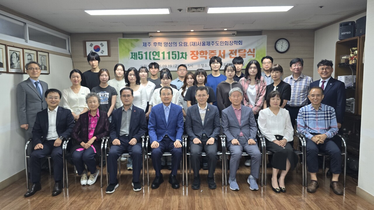 🎓서울제주도민회 장학회, 2025년 2학기 장학금 5400만원 전달서울제주도민회 장학회(이사장 김창희)는 지난 19일 서울 도민회관에서 2025년 2학기 장학증서 수여식을 열고 김창희 이사장은 수여식에서 “서울제주도민회 장학회는 57년 전 제주 후학을 양성하겠다는 뜻으로 회원들이 십시일반 후원금을 모아 창립됐다”며 “제주의 인재로 성장해 지역사회와 국가 발전에 이바지하길 바란다”고 말했다.